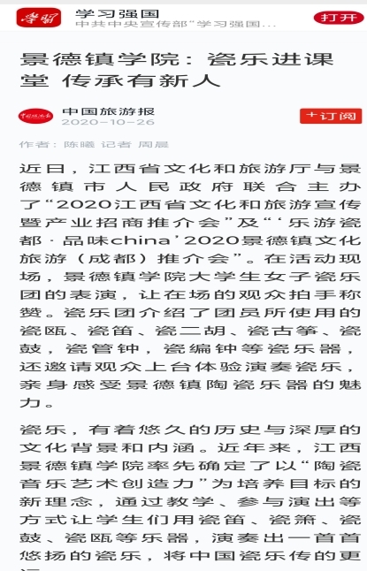 “罄音”瓷乐团被中国旅游报刊登题为《英国beat365官方网站:瓷乐进课堂 传承有新人》专题报道并被“学习强国”学习平台予以转载