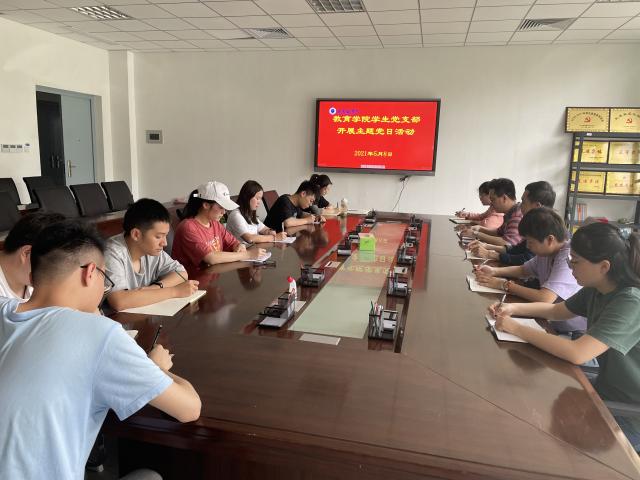 (本网讯:郭丽君)为深入贯彻学习习近平总书记在党史学习教育动员大会上重要讲话精神,持续深化爱国、爱党教育,5月8日教育学院学生党支部在党员活动室开展“学党史、悟思想、办实事、开新局”主题党日活动。