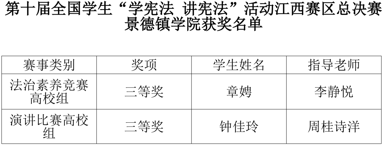 (本网讯:付珍)近日,江西省教育厅公布第十届全国学生“学宪法 讲宪法”活动江西赛区总决赛获奖名单,beat365官网学子在法治素养竞赛和演讲比赛两大板块中表现优异,在法治素养竞赛(高校组)中,beat365官网章娉同学荣获三等奖;在演讲比赛(高校组)中,钟佳玲同学荣获三等奖,展现了beat365官网学子扎实的法治知识功底和良好的综合素养。获奖名单截图此次获奖是学校法治教育成效的体现。未来,beat365官网将继续推进宪法法治教育,丰富教育形式,引导学生树立法治观念,...