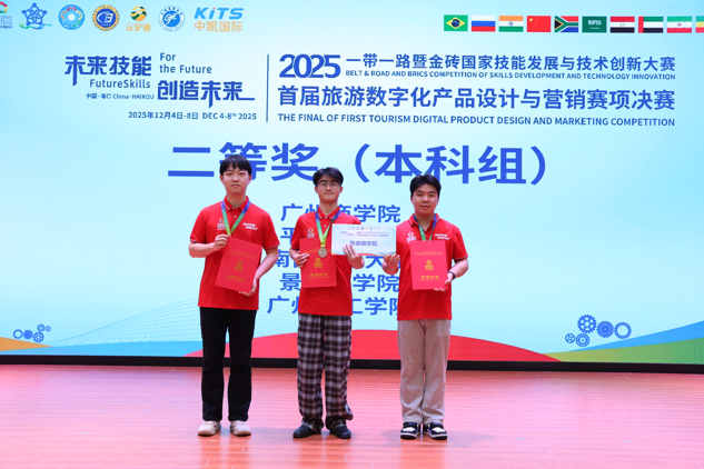 (本网讯:经济管理学院)12月7日,2025年“一带一路”暨金砖国家技能发展与技术创新大赛首届旅游数字化产品设计与营销赛项全国总决赛在海南经贸职业技术学院圆满落幕。beat365官网经济管理学院2023级酒店管理班黄建、姚金杰、夏绍君三位同学组成的“瓷光数影”队,在刘瑜辉、凌静两位教师的指导下,凭借扎实的专业功底与创新的实践方案,斩获本科组二等奖,为学校赢得荣誉。比赛现场合影比赛中,“瓷光数影”队展现出过硬的综合素养:理论考试环节,...