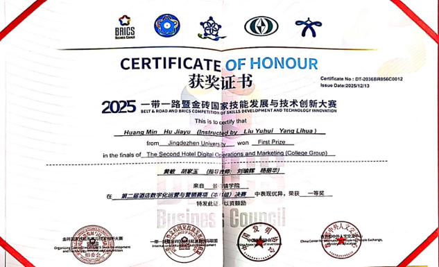 (本网讯:经济管理学院)近日,2025一带一路暨金砖国家技能发展与技术创新大赛第二届酒店数字化运营与营销赛项全国总决赛在云南德宏职业学院圆满落幕。经济管理学院2024级酒店管理班胡家玉、黄敏两名同学,在刘瑜辉、杨丽华老师的指导下,凭借扎实的专业能力斩获本科组一等奖,为beat365官网赢得荣誉。获奖证书 经管学院供图本次赛项以“面向国际市场、突出中国特色、应用数字技术、提升数字应用”为宗旨,紧扣酒店行业数字化转型趋势,旨在培养兼具国际化视野与高技术技能的复合型人才。...