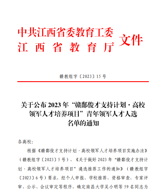 据悉,“赣鄱俊才支持计划·高校领军人才培养项目”已列入省委、省政府中长期人才发展规划纲要,是我省重大人才工程的组成部分,下设子项目“领军人才”和“青年领军人才”。该项目原为江西省“井冈学者奖励计划”,自2023年起该计划变更为“赣鄱俊才支持计划·高校领军人才培养项目”。“高校领军人才培养项目”实行岗位聘任制,每两年组织遴选一次,每次遴选20名左右“领军人才”和60名左右“青年领军人才”。