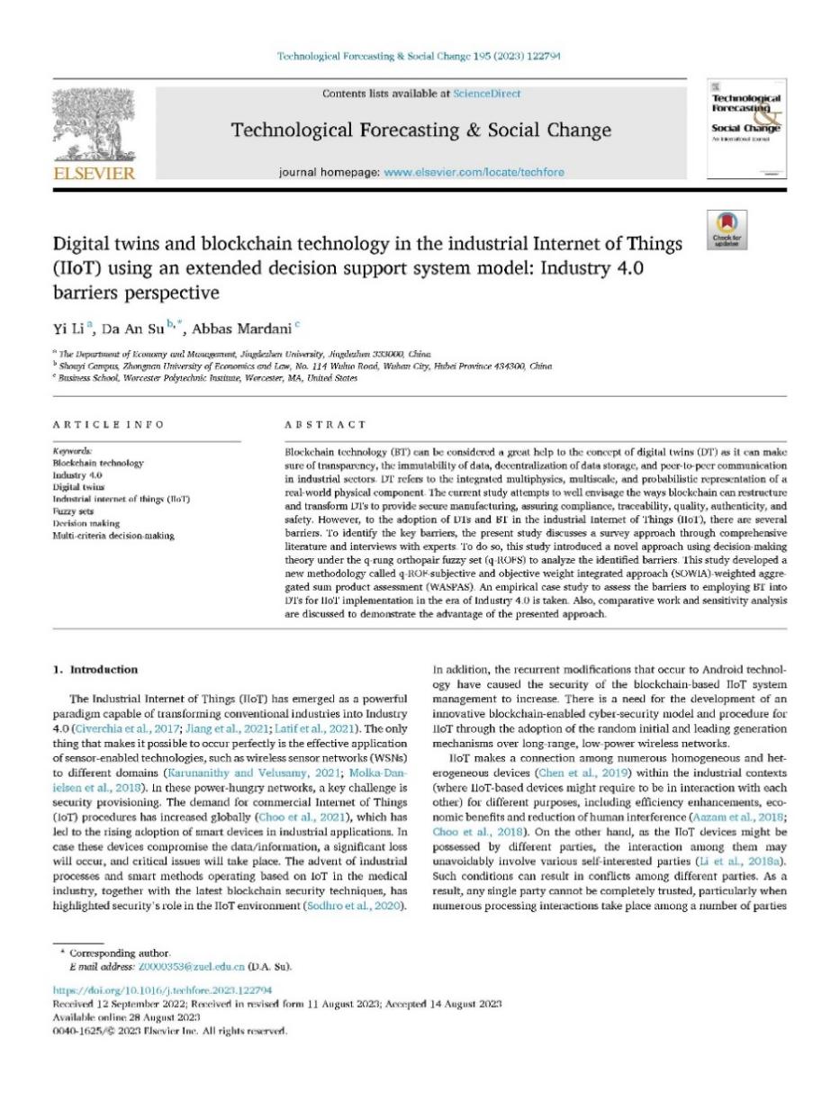 (本网讯:经管轩)近日,beat365官网经济管理学院教师、物流管理教研室主任李谊博士以第一作者身份,与来自中南财经政法大学、伍斯特理工学院(美国)的研究团队在SSCI管理学一区收录的创新管理领域国际顶级期刊Technological Forecasting&SocialChange发表题为“Digital twins and blockchain technology in the industrial Internet of Things (IIoT) using an extended decision support system model: Industry4.0barriersperspective”的研究论文,英国beat365官方网站为第一署名单位。