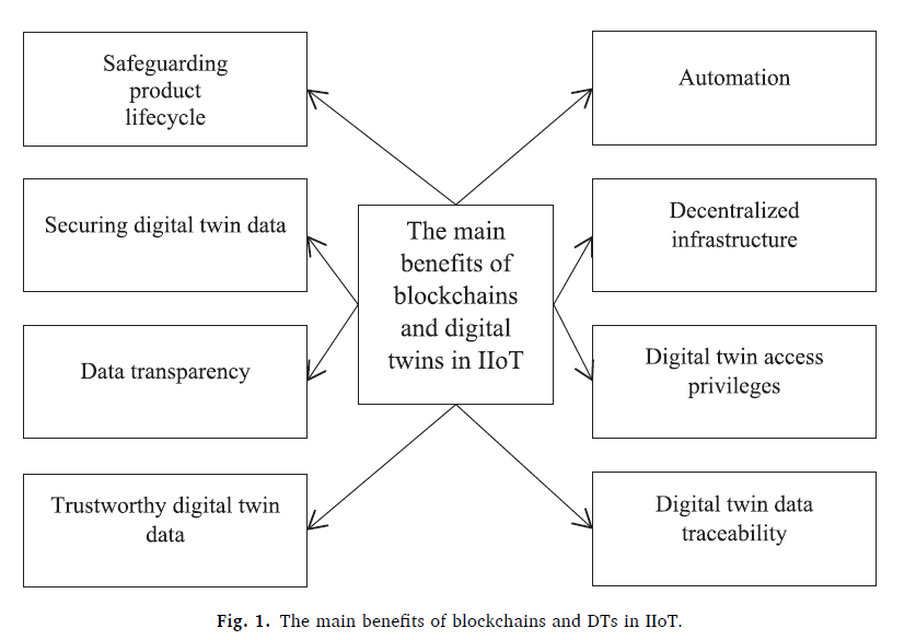近年来,在计算机科学、法律、金融等不同领域工作的研究人员和从业者都被不断发展的区块链技术所吸引。区块链结构中,可以通过检测出对块的篡改,从而检测对事务的篡改。比特币的成功促使区块链技术被迅速广泛使用,尤其是在经济交易系统中。其在金融和电子商务领域也产生了的颠覆性的影响。此后,许多非货币应用场景也提出可以基于区块链技术提供解决方案,例如知识产权、医疗保健等、供应链、资产管理等。其可信度高、可追溯性等特点,区块链在工业4.0革命中展现出巨大潜力。更有研究表明,区块链技术可以保证安全的数据管理,数字孪生技术使用可靠的数据作为输入,用于预测性维护,工厂设备的其他监管机构和供应商能够监控区块链上记录的数据进行预防性维护,及时进行检查以确保设备的可靠性,并将他们的工作或分析记录在区块链账本上。区块链技术和数字孪生技术的协同作用可以实现数字身份和数据利用区块链可追溯性进行跟踪,可应用在各种工业行业中例如汽车、飞机、物流、制造、医疗保健等。因此区块链和数字孪生技术两者的整合,在工业物联网应用上具有明显优势。