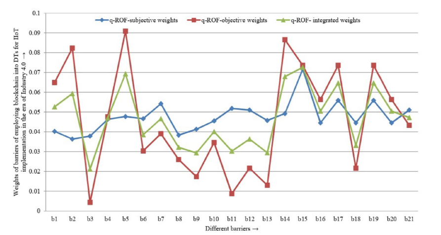 但是数字孪生和区块链技术在工业4.0时代下的工业物联网中的应用中存在诸多壁垒。本研究基于文献研究和专家访谈,确定了其主要壁垒。并在识别出以上主要壁垒基础上,引入新的基于q-ROFS理论的决策方法,开发了一种新的模型——q-ROF-SOWIA-WASPAS模型对各壁垒进行分析,得到各壁垒权重值。