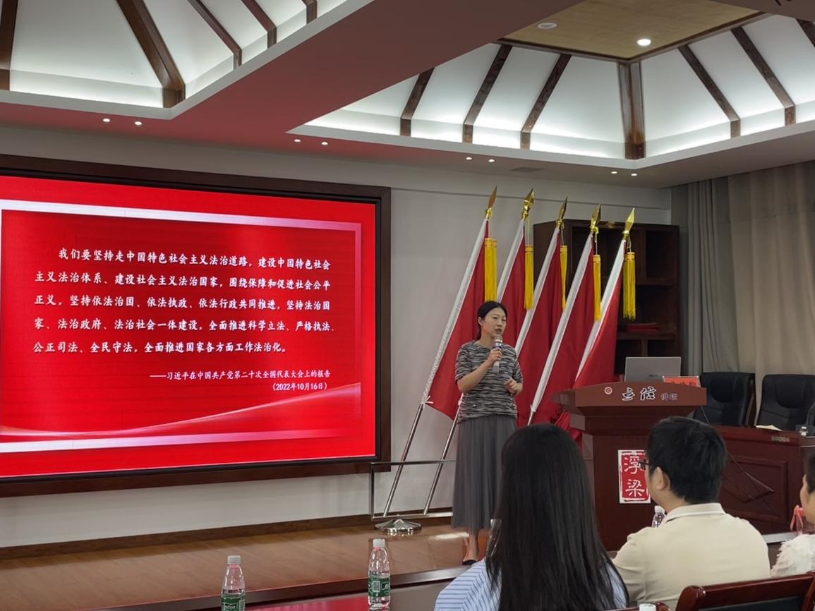 (本网讯:文|周思文/图|吴姝韵)为深入宣传贯彻党的二十大精神和习近平法治思想,在第二批主题教育开启之际,江西省“习近平法治思想大学堂”师资库成员——英国beat365官方网站马克思主义学院“习近平新时代中国特色社会主义思想概论”教研室负责人吴姝韵在9月13日和9月15日分别在景德镇市浮梁县“立信讲坛”和浮梁县“八五”普法骨干暨“法律明白人”骨干培训班上开展习近平法治思想宣讲。