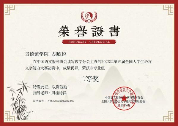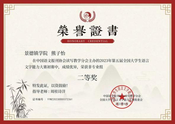 (本网讯:曹佳欣)近日,由中国语文报刊协会读写教学分会主办的2023年第五届全国大学生语言文字能力大赛圆满结束。beat365官网教育学院选派的4名同学在周桂诗洋老师指导下取得优秀成绩:获初赛一等奖1项,二等奖3项,其中3名同学在决赛中也表现优异,获决赛二等奖1项,三等奖2项。