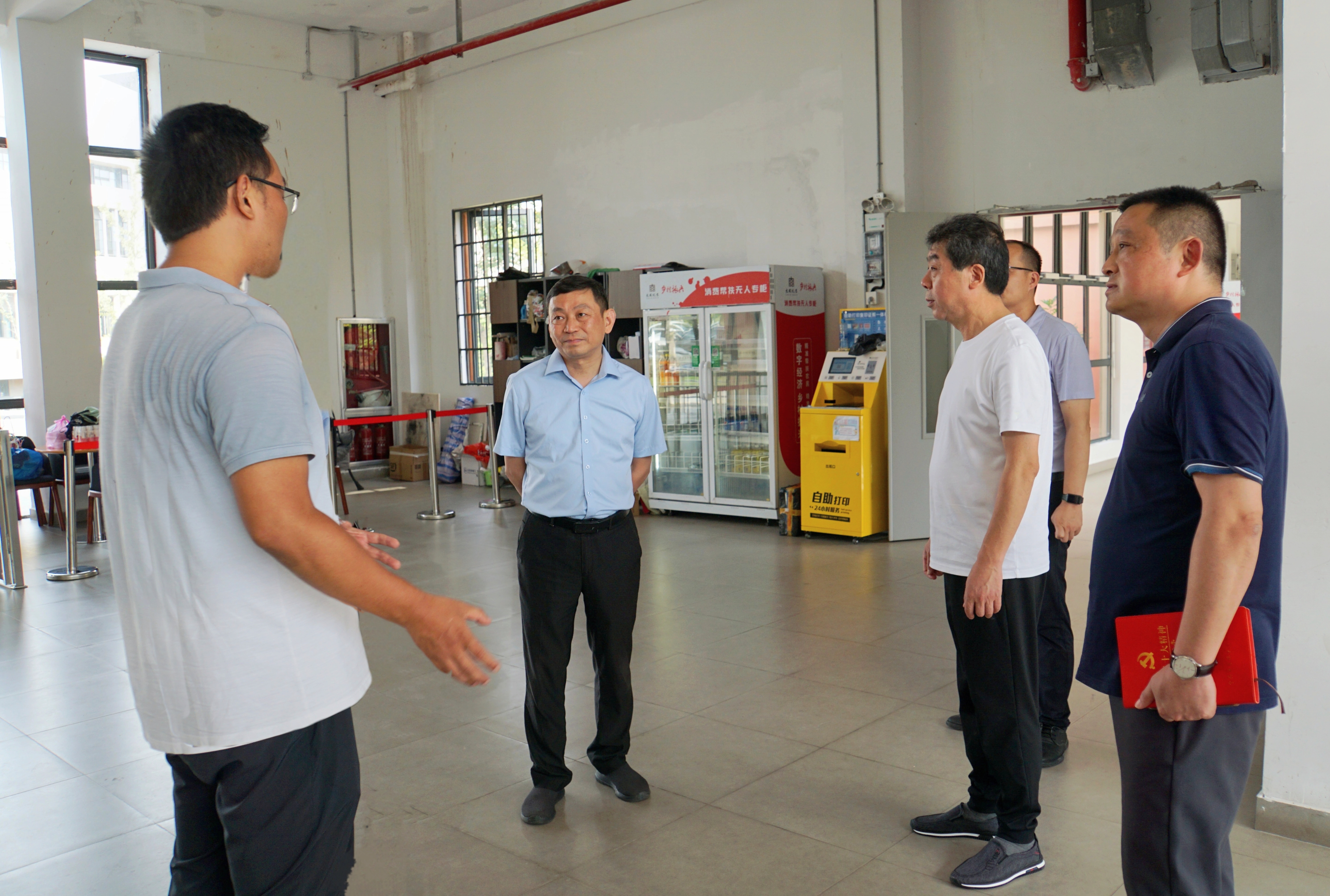 陈运平随后走访了学生宿舍、食堂等地,询问学生的食宿安排,检查食品和宿舍的安全情况等,他对一线工作人员为留校学生的付出表示感谢,对留校学生住宿管理、日常教育、安全管理等方面提出相应要求。紧接着,一行人来到教学楼,“同学,图书馆自习室全天提供空调,你们可以到那里去自习。”天气炎热,对选择在教学楼自习的同学,陈运平热心地给予建议并和他们热情地对话交流。