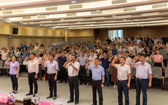 会议伊始,全体党员起立,右手握拳,在叶观荣的领誓下重温入党誓词,回望初心,砥砺前进。在庄严的《义勇军进行曲》的旋律中,全体党员奏唱国歌,大会拉开序幕。