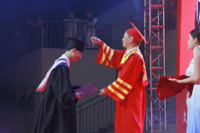 校党委副书记、校长陈运平为获得学士学位的毕业生代表授予学位证书、行拨穗礼