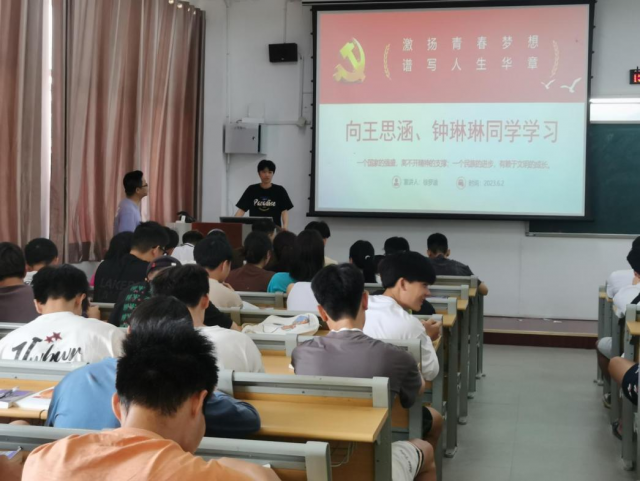 (本网讯:蔡梓文)王思涵、钟琳琳在第17届中国大学生跆拳道锦标赛上获得佳绩的喜讯传遍校园,同学们深受鼓舞,引起很大反响。6月5日下午,体育学院20级体育教育专业班学生召开“激扬青春梦想、谱写人生华章”主题班会,掀起了向王思涵、钟琳琳学习的高潮。