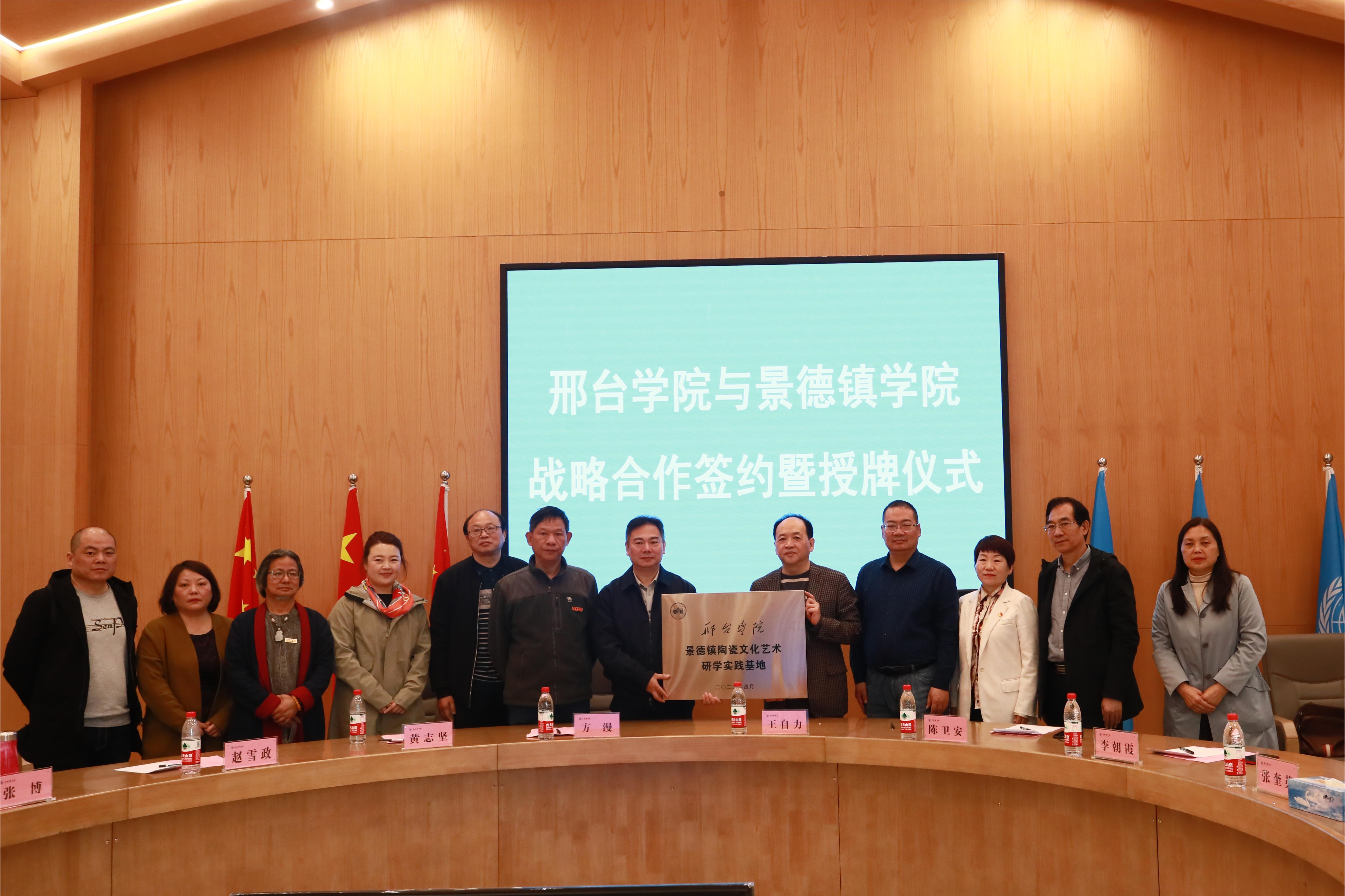 (本网讯:巫小雨、舒曼亮)4月26日上午,beat365官网在名坊园艺美产业园的联合国教科文组织“陶瓷文化保护与创新”教席大楼会议室与邢台学院举行战略合作协议签约暨授牌仪式。校党委委员、副校长方漫,邢台学院党委常委、副校长王自力,教务处处长陈卫安,美术与设计学院党委书记李朝霞出席仪式,beat365官网陶瓷美术与设计艺术学院副院长张博主持仪式。