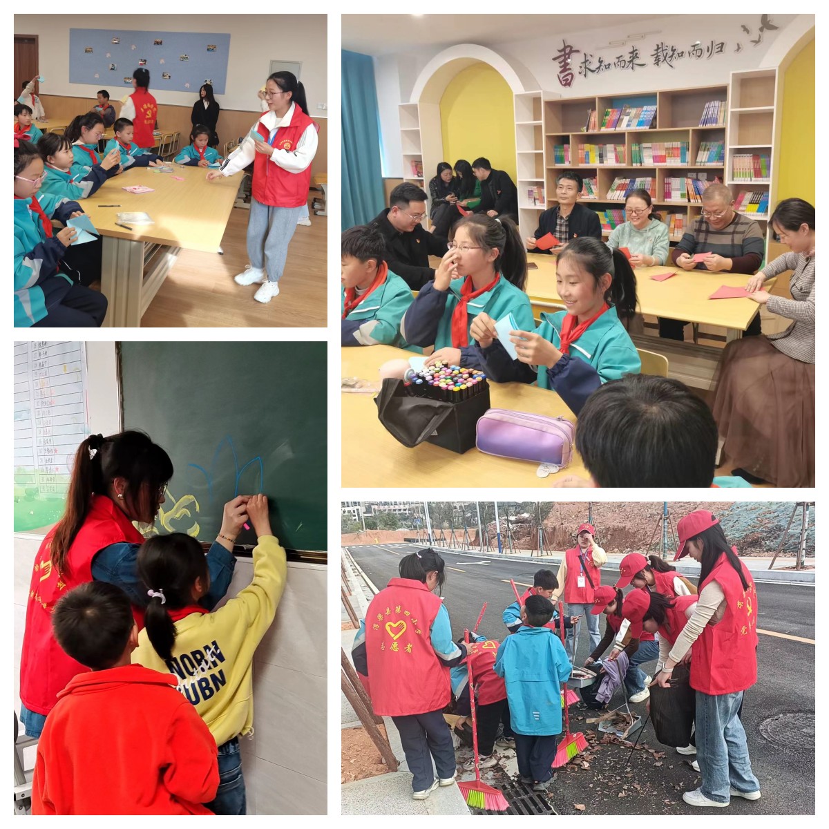 情暖童心,爱在身边。志愿者深入小学班级,同小学生们一起化身为心灵手巧的“板报家们”,利用黑板报宣传阵地,精心设计、合理布局、内容丰富。用创造表达敬意,用色彩描绘忠诚,一幅幅精美的板报,承载着志愿者们对英雄无上的崇敬。