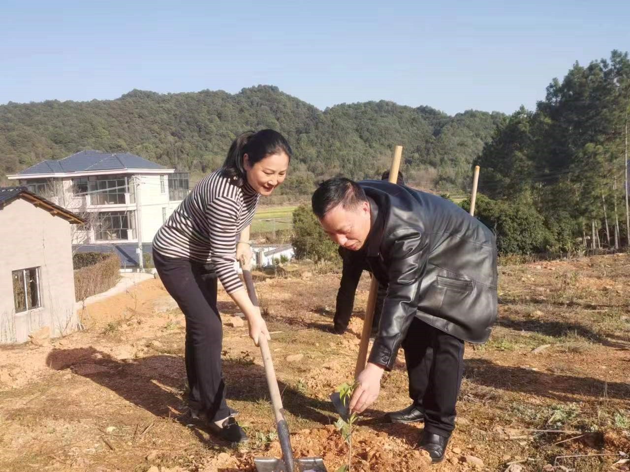 在村干部引领下,大家来到植树现场,手持铁锹、锄头等劳动工具,有条不紊、配合默契,用心栽下一棵棵油茶树苗。大家分工合作,有的挥锹铲土、有的清理树坑、有的扶稳树苗、有的培实新土,在大家的共同努力下,一排排新树苗错落有致,在和煦的春风里迎风挺立,洋溢着勃勃生机。
