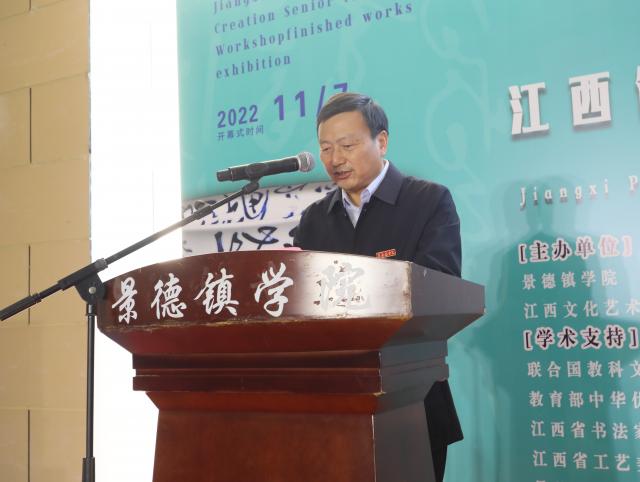 王丽心首先代表学校对领导与嘉宾的到来表示热烈欢迎和衷心感谢,对参加研修班授课的老师和项目组团队的辛勤付出致以崇高敬意,对此次研修班学员创作的丰硕成果表示祝贺!他指出,陶瓷书法是中华传统文化精髓的浓缩,以陶瓷为载体进行书法创作,是一门古老而又独特的中国传统艺术,是中国文字学、中国书法学最重要的史料,是华夏文明的见证。从研修班老师和学员精心创作的陶瓷书法作品,可以看到陶瓷书法艺术一方面集成了传统中华文化的独特魅力,有着极大的感染与感召能力;另一方面作为继承与发展的创新之作,其现代大胆的表现形式受到了大众的高度期望与热烈追逐,是新时代兼具经典优雅的新型文化产物。他强调,“推进文化自信自强,铸就社会主义文化新辉煌”,党的二十大报告强调“坚持以人民为中心的创作导向,推出更多增强人民精神力量的优秀作品”,学校将继续朝着这一方向努力,牢记习近平总书记芸芸嘱托,积极策应景德镇国家陶瓷文化传承创新试验区建设,服务地方经济社会发展和文化传承创新,打造对外文化交流新平台。