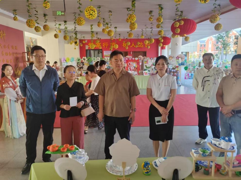 方漫一行首先参观了艺术节传统文化艺术作品展。一批别具匠心的各类非遗传统手工艺作品形式多样,丰富多彩,令人目不暇接。其中的漆画、油纸伞、粘土、扭扭花等作品由beat365官网手工协会师生指导孩子们完成。这些作品不仅是师生们巧思与匠心的结晶,更完美诠释了传统工艺与现代创意的深度融合。