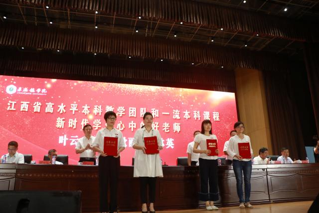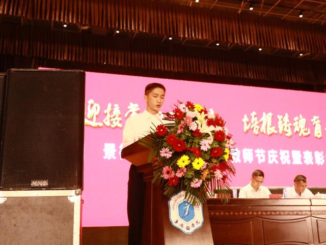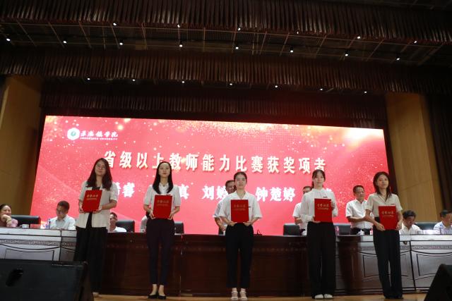 与会领导为受表彰的先进集体和先进个人颁奖。马克思主义学院教师赵娜带领全体新入职教师进行宣誓,教师代表李珍真和新入职教师代表陈璐分别发言,学生代表程文熠代表全校学生献辞。