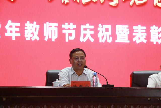 他指出,百年大计,教育为本;教育大计,教师为本。习近平总书记对广大教师非常重视和关心,每年教师节都会前往学校看望师生,致信祝贺问候,为全党做出了尊师重教的表率。教育部、省教育厅就如何做好庆祝教师节专门下发通知,要求各级党委政府、全社会大力弘扬尊师风尚,以昂扬向上的精神面貌和扎实行动迎接党的二十大胜利召开。