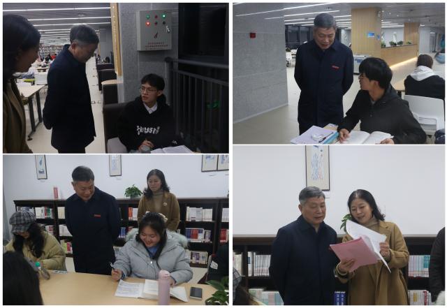 晚上7时许,李良智走进图书馆了解学生自习情况,他轻声走到同学身旁,观察同学们借阅的书籍。随后李良智走进红色阅读室,看见红色阅读室里座无虚席,同学们都在认真的翻阅红色书籍,学习红色革命故事,他还了解到今年图书馆的借阅量达到八万多,是去年的三倍多,非常欣慰。