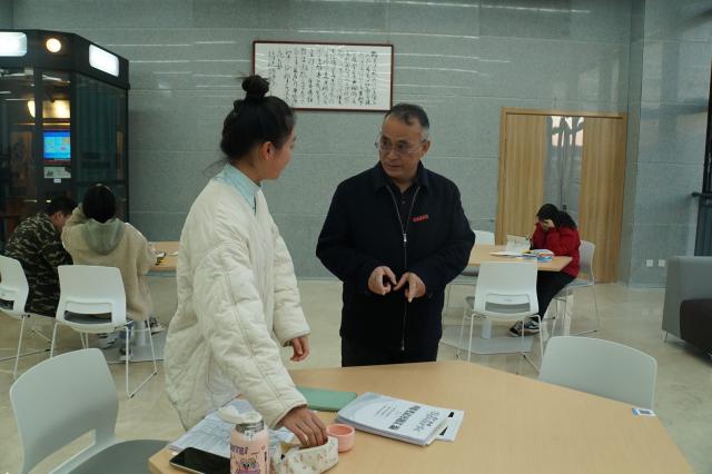 下午5时许,陈雨前来到图书馆,了解学生自习情况。他轻声慢步,仔细观察同学们阅读的书籍。和一名正在备考的学生亲切交谈,他面带微笑地聆听学生对未来的规划,提供相关建议和意见,并鼓励同学加油努力,预祝同学考试顺利。平易近人的话语,长辈般的鼓励让同学的欣喜之情溢于言表,他表示有幸能够和校长像知心朋友一样交谈,感觉很温暖,一定会好好努力,不负校长的期望。图书馆内静悄悄,同学们认真的学习状态,刻苦钻研的学习氛围,让陈雨前感到十分欣慰。