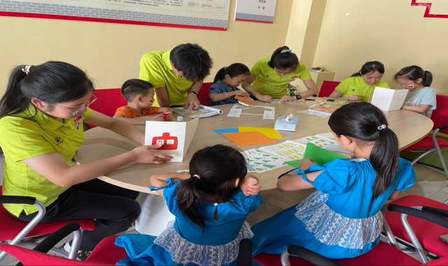 志愿服务队队员教小朋友们剪纸