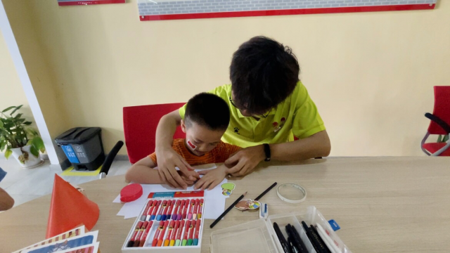 志愿服务队队员陈鸿旺教小朋友绘画