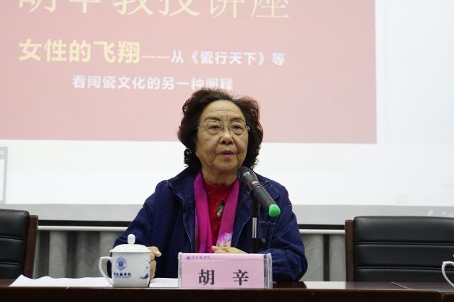 胡辛从“瓷行天下张扬的是一种精神”、“飞翔是人类的追求”、“陶瓷文化的灵魂就是传承与创新”和“脚踏实地的践行”四个方面进行了系统的分析和阐述。她以自身事例出发,和师生们分享了她从创作中找到自身价值,感受女性飞翔姿态的经历。她结合《瓷行天下》等作品,以瓷说史,围绕“瓷行天下张扬的是一种精神”为在场师生生动地介绍了中国陶瓷文化的源远流长,全方位呈现了中国陶瓷文化传播的历史沧桑。当谈到女性因文学而呈现飞翔姿态时,她朗读了一首《永远的飞翔不朽的飞翔》,令在场师生为之动容,报以热烈掌声。胡辛表示,瓷运与国运互为象征象喻。她从中国陶瓷史的角度证明陶瓷文化的灵魂就是传承与创新,瓷文化生生不息就在于不同文化之间的相互交流借鉴。