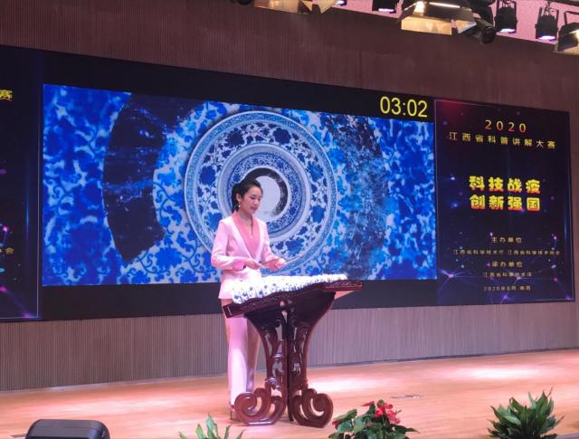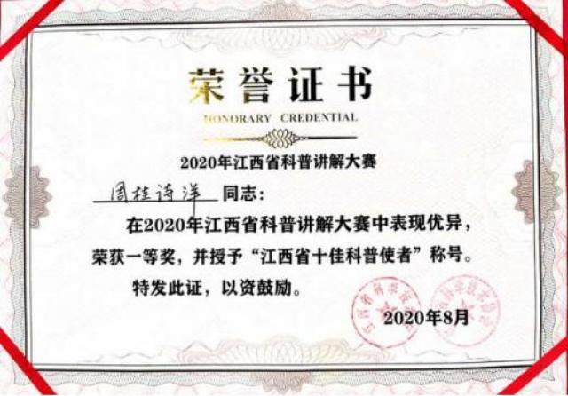 经过激烈角逐,8月16日,2020年度江西省科普讲解大赛在省科学技术新馆圆满落幕,周桂诗洋老师总分全省第一,获一等奖,被授予“江西省十佳科普使者”称号,代表我省决战2020年度全国科普讲解大赛。