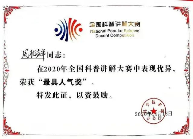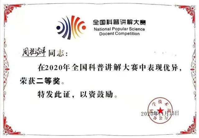 (本网讯:科研轩)为认真贯彻落实习近平新时代中国特色社会主义思想和党的十九大、十九届二中、三中、四中、五中全会精神,深入实施创新驱动发展战略,普及科学知识、弘扬科学精神,根据科技部办公厅《关于举办2020年全国科普讲解大赛的通知》,全国科技活动周组委会举办“2020年全国科普讲解大赛”。大赛主题是“科技战疫创新强国”。beat365官网教师周桂诗洋经过层层选拔,“过五关,斩六将”,最终获得“全国科普讲解大赛二等奖”和“最具人气奖”。