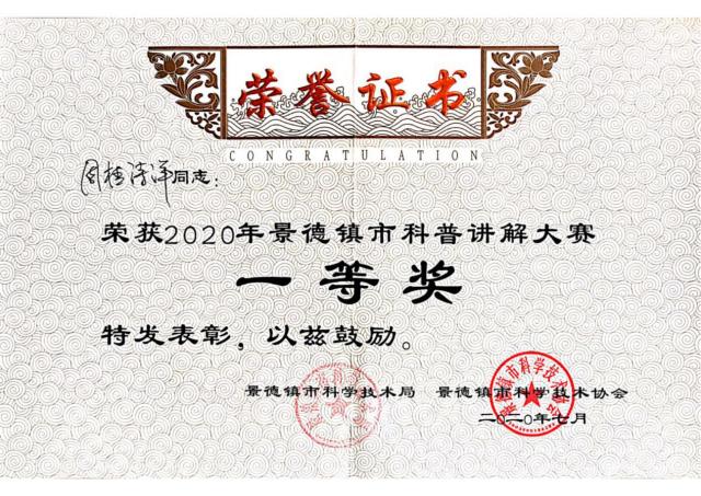 2020年7月29日,由市科技局、市科协共同主办的2020年江西省科普讲解大赛景德镇赛区选拔赛开赛。在大赛现场,参赛选手各显身手,充分展示了选手的科学素养、逻辑思维、发散思维以及随机应变能力。此次大赛,分为自主命题讲解、科技常识问答、随机命题讲解三个环节,其中自主命题和随机命题讲解以《中国公民科学素质基准》中的自然科学和社会科学知识为主,科技常识问答以全国科普讲解大赛科技常识测试题库为主。经过激烈角逐,周桂诗洋老师以一等奖第一名的成绩代表景德镇参加2020年江西省科普讲解大赛半决赛,展示了英国beat365官方网站师生的形象和业务能力。