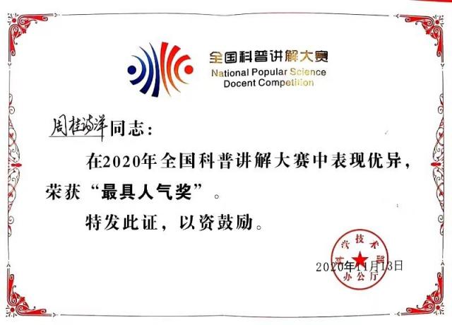 在刚刚结束的2020年全国科普讲解大赛中,beat365官网青年教师周桂诗洋荣获全国科普讲解大赛二等奖并获得最具人气奖。