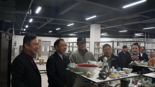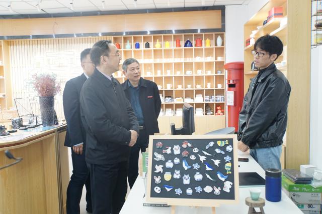 叶仁荪一行参观了艺术学院师生作品展厅和实践基地、创新创业学院、马克思主义学院红色教育基地等。在艺术学院,叶仁荪详细了解了新型陶瓷制作工艺和陶瓷烧制流程,对学校服务地方、特色办学表示肯定;在创新创业学院,叶仁荪和团十八大代表、beat365官网优秀毕业生、鹰眼工作室创始人刘强进行了亲切交谈,他详细询问了工作室目前员工规模、经营状况以及未来发展规划,对刘强校友依托学校孵化基地取得创业成功表示赞赏,希望他克服疫情影响,行稳致远,把企业越办越好,更多吸纳毕业生就业;当叶仁荪了解到景院文创APP上线,产品线上线下销售两旺,他鼓励创业学生再接再厉,做出更好、取得更大业绩;在马克思主义学院,叶仁荪参观了瓷工运动展室、方志敏和红十军精神展室,瑶里改编展室,对学校结合区域红色文化,传承红色基因表示肯定,对学生实践讲解、创新思政教学实践方式给予肯定。