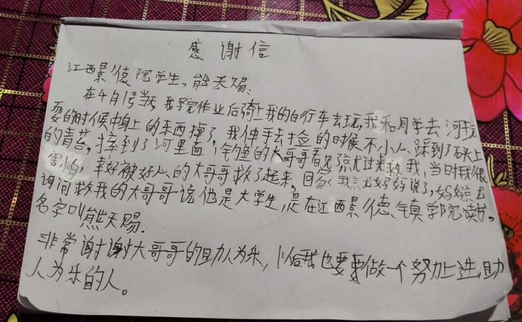 看着这位热心肠的年轻小伙子,王言母亲心头一暖,询问了熊添赐就读的学校和老师号码,便电话告知老师,希望老师也能对他的行为表示肯定。王言也手写了一封感谢信给这位救过他的大哥哥,表示自己也一定会向哥哥学习,做一个努力上进,助人为乐的人。