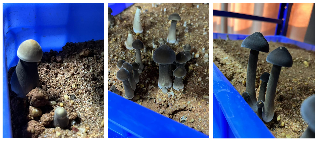 此次黑皮鸡枞菌的栽培采用覆土栽培方式。经过食用菌产业团队对黑皮鸡枞菌栽培条件的摸索、讨论和实践后,引种培育的黑皮鸡枞菌终于破土而出。伴随着悉心照顾,菌株茁壮生长,此次黑皮鸡枞菌的引种与培育圆满成功。