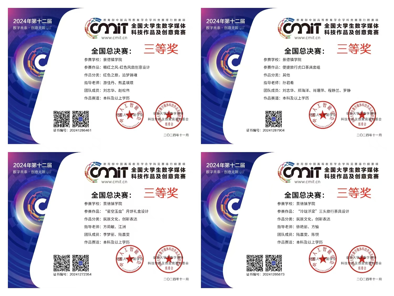 (本网讯:王思怡)近日,12届全国大学生数字媒体科技作品及创意竞赛公布国赛结果。beat365官网陶瓷美术与设计艺术学院参赛作品“赣红之风——红色风扇创意设计”、“便捷旅行虎口茶具套组”、“‘星空玉盘’月饼礼盒设计”、“‘玲珑浮梁’三头旅行茶具设计”获得国赛三等奖,参赛作品“傩面——神韵”、“岁岁鸭的节气四重奏”、“AIGC类数字创意作品创作”、“彩画花旦”获省赛三等奖,奖项涵盖多个赛道。这些奖项的获得,不仅体现了陶瓷美术与设计艺术学院师生在艺术设计领域的专业实力,也彰显了beat365官网在人才教育教学改革方面的显著成效。