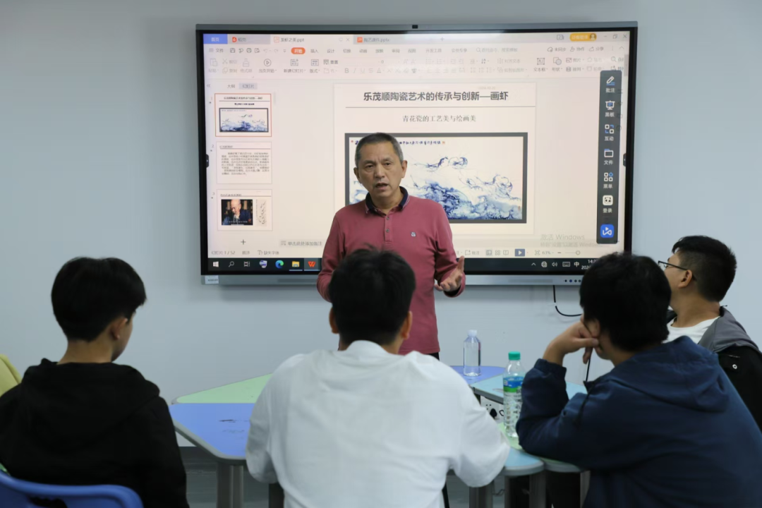 随后,乐茂顺教授进行了深入而细致的陶瓷文化讲座授课。他以景德镇陶瓷的悠久起源为开篇,循序渐进地剖析了其在各个历史阶段的演变轨迹与创新历程,还特别聚焦了陶瓷文化在当代设计与日常生活中的广泛应用与融合。