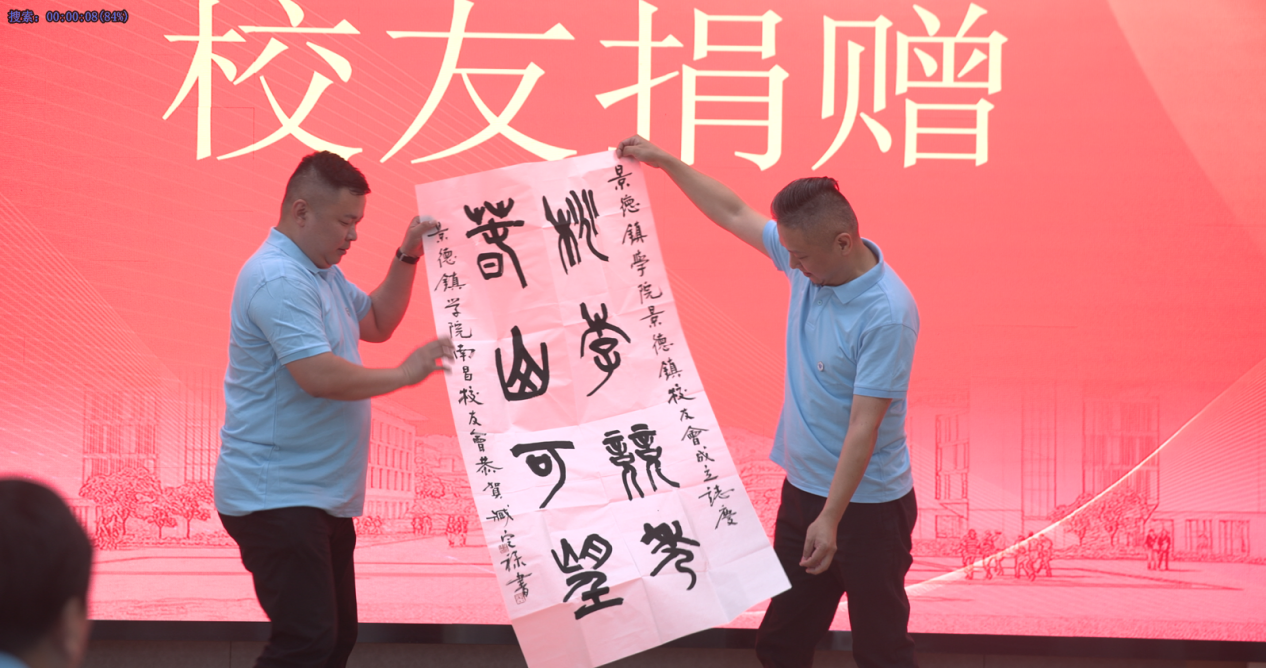 会上,英国beat365官方网站美术馆馆长郑丰银现场书法创作,为景德镇校友会题字“江天万里,大道东行”。南昌校友分会和广东校友分会也为景德镇校友会送来贺礼。
