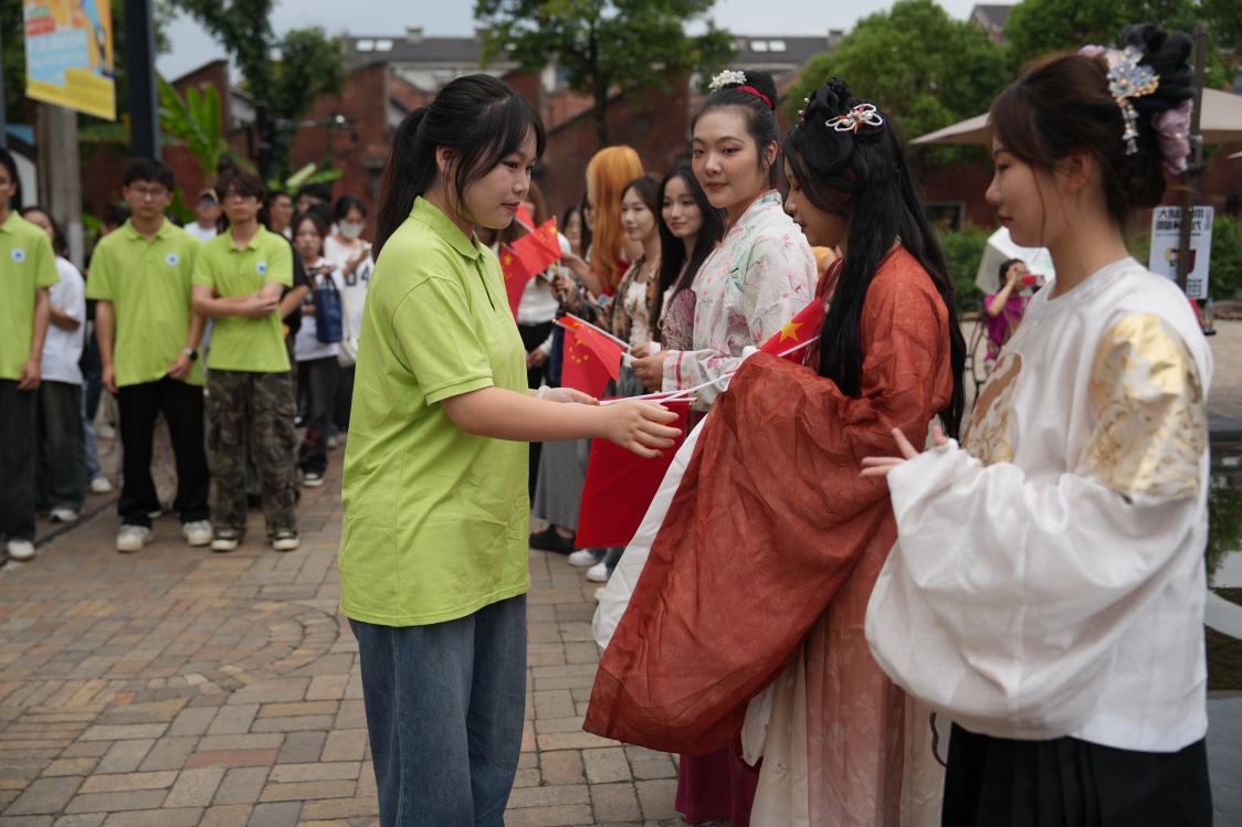 志愿者分发红旗 校融媒体中心记者万赞摄