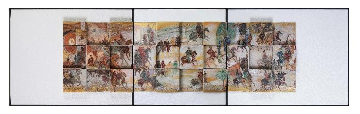 该作品灵感源自敦煌莫高窟第156窟南壁的古代壁画,其独特之处在于将传统壁画元素与现代陶瓷艺术进行了精妙融合。通过细腻入微的雕刻技艺与丰富多彩的色彩呈现,生动再现了古代丝绸之路的辉煌盛景,彰显了徐冰在陶瓷艺术领域的深厚造诣与创新精神。
