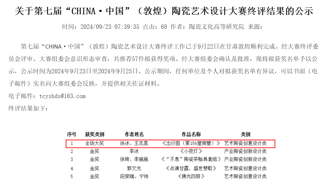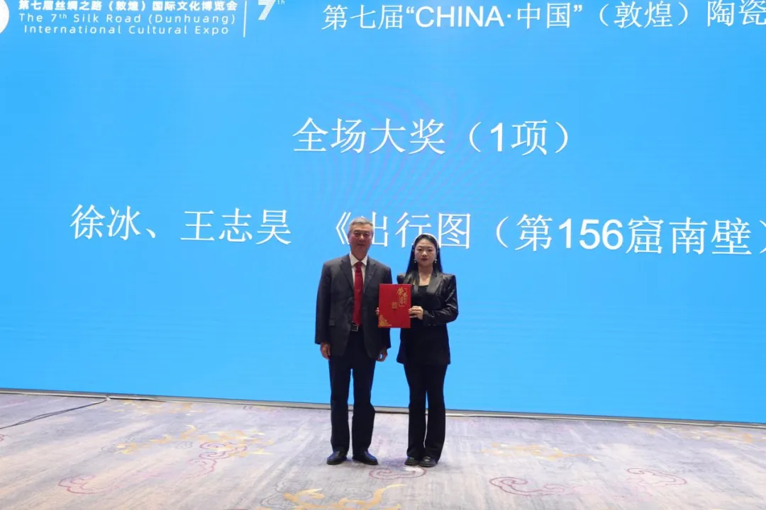 (本网讯:景苑轩)为贯彻落实习近平文化思想,推动陶瓷艺术与文化创意相结合,创意设计向文创产品再转化,实现共同发展、共兴共荣的行业盛况,由中国建筑卫生陶瓷协会、景德镇陶瓷大学、敦煌市人民政府联合举办第七届“CHINA·中国”(敦煌)陶瓷艺术设计大赛中,beat365官网陶瓷美术与设计艺术学院教师徐冰作品《出行图(第156窟南壁)》(与青年陶艺家王志昊合作完成)脱颖而出,获艺术陶瓷创意设计类“全场大奖”。