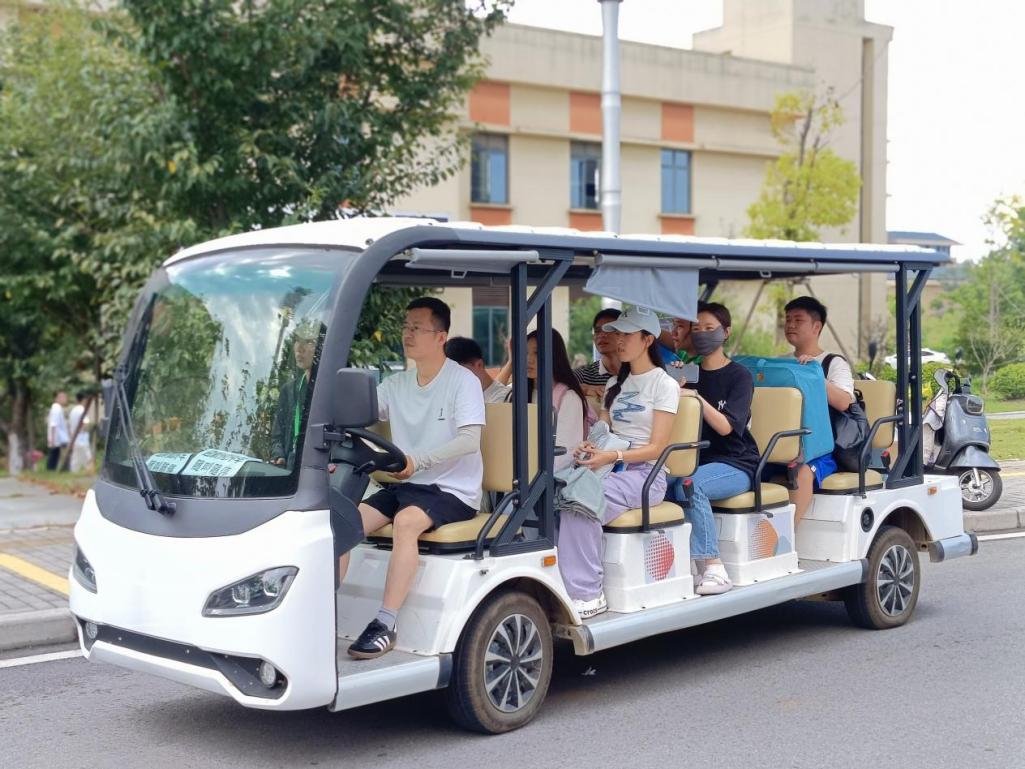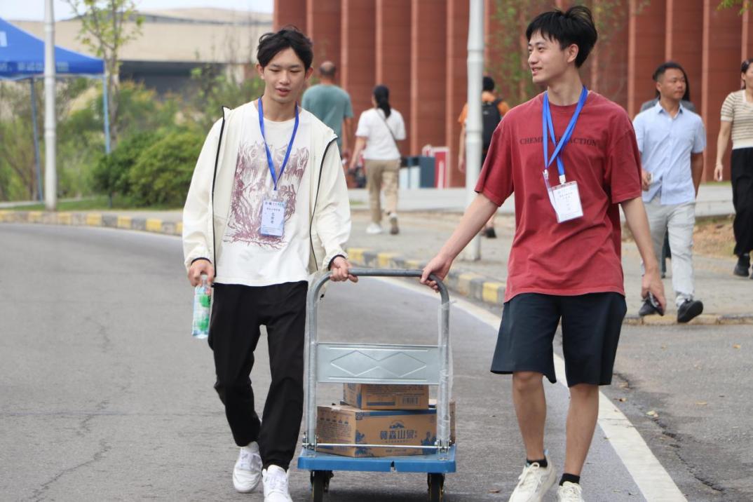 产教融合大楼外,巨大的欢迎立牌矗立,各二级学院的报到点、学校资助服务点、“一站式学生社区”服务点等整齐排列,助力新生“一站式”完成入学程序;学校师生志愿者们穿梭于火车站、汽车站、迎新站点及宿舍楼之间,校内摆渡车一辆接着一辆,持续不断运送行李,在提供便利的同时还引导车辆,为新生和家长们提供全方位的帮助与服务。