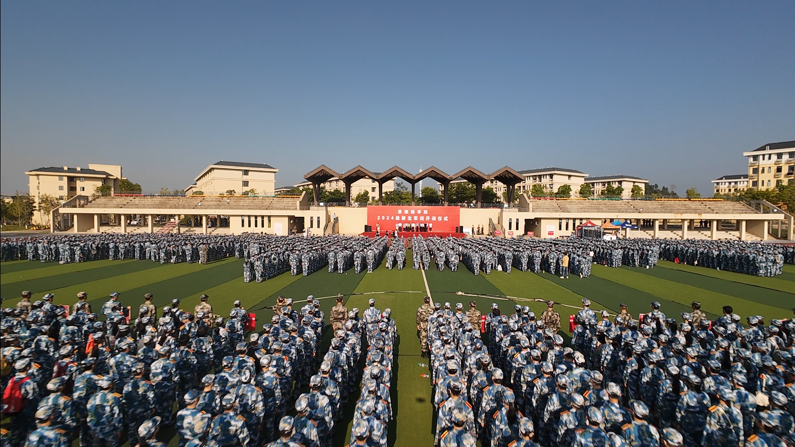 开训仪式在庄严的国歌声中正式拉开帷幕,全体师生昂首肃立,向国旗行注目礼,齐唱国歌。秋日的阳光遍洒宽阔的田径场,“华夏红”与“迷彩蓝”交相辉映,青春梦从此处启航。