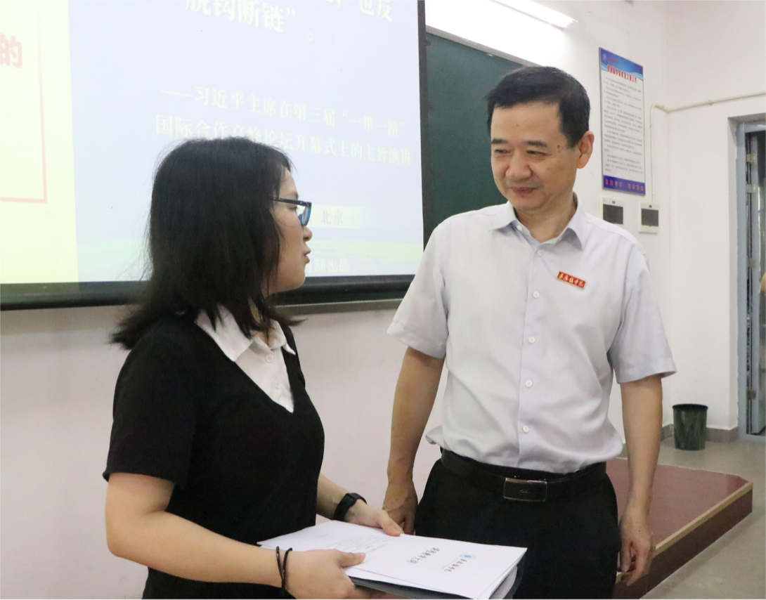 (本网讯:文|欧阳晰/图|校融媒体中心记者团)9月2日上午,党委书记叶观荣,党委副书记、校长熊震宇,党委副书记王丽心,党委委员、副校长方漫,副校长黄志坚,党委委员、副校长周清平,党委委员、纪委书记罗少韬,党委委员、组织部部长朱贺江,党委委员、统战部部长万文军,党委委员、宣传部部长赵雪政在教务处和各二级学院负责人的陪同下走进一线课堂,与同学们共听“开学第一课”,检查新学期教学运行情况。