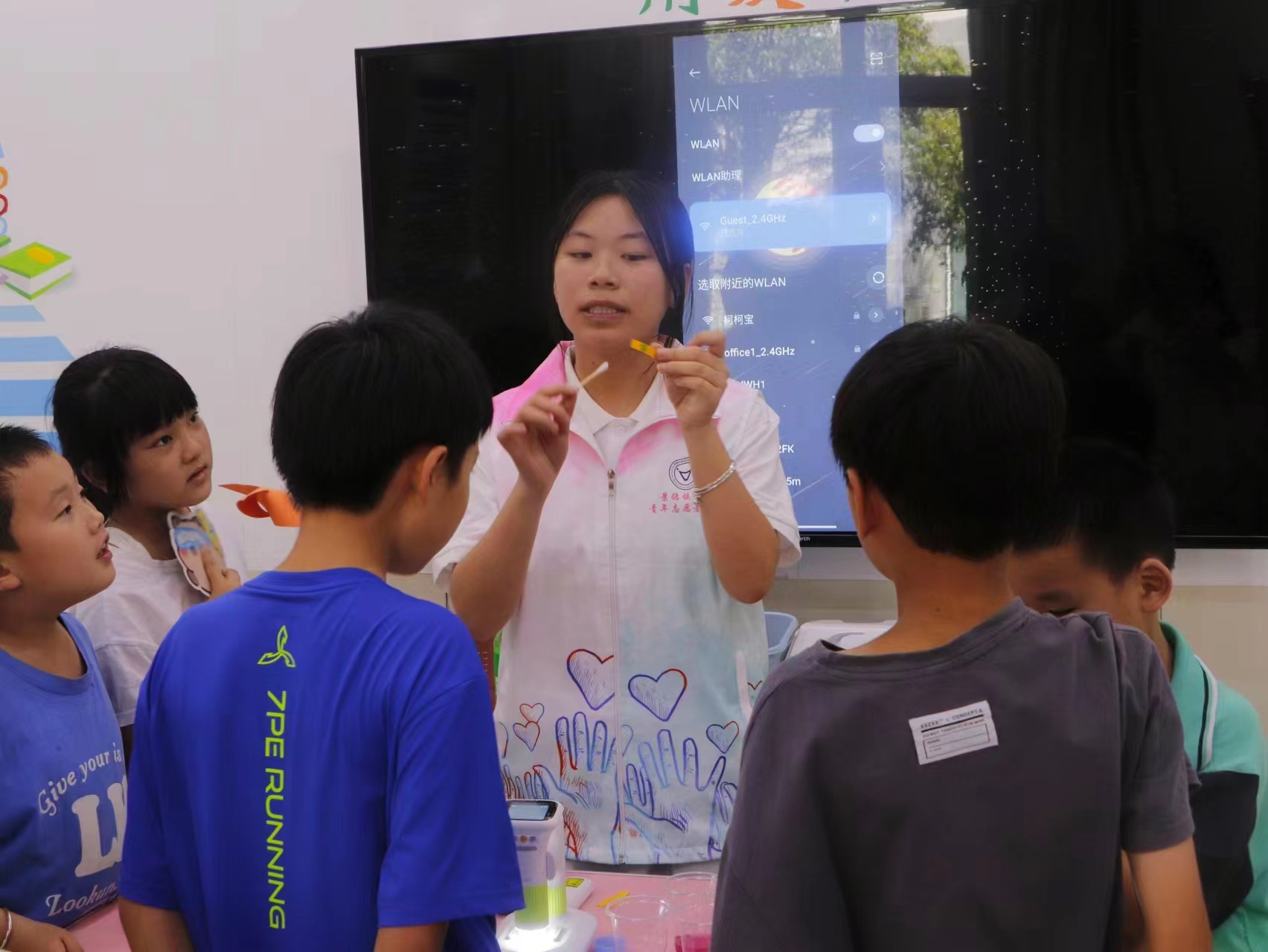志愿服务队成员温丽梦用实验来展示基础化学知识,向孩子们展示神奇的酸碱变色。在服务队成员的引导下,孩子们慢慢掌握了变色魔法诀窍,并立志要成为“魔法家”,憧憬着科学报国的美好梦想的实现。