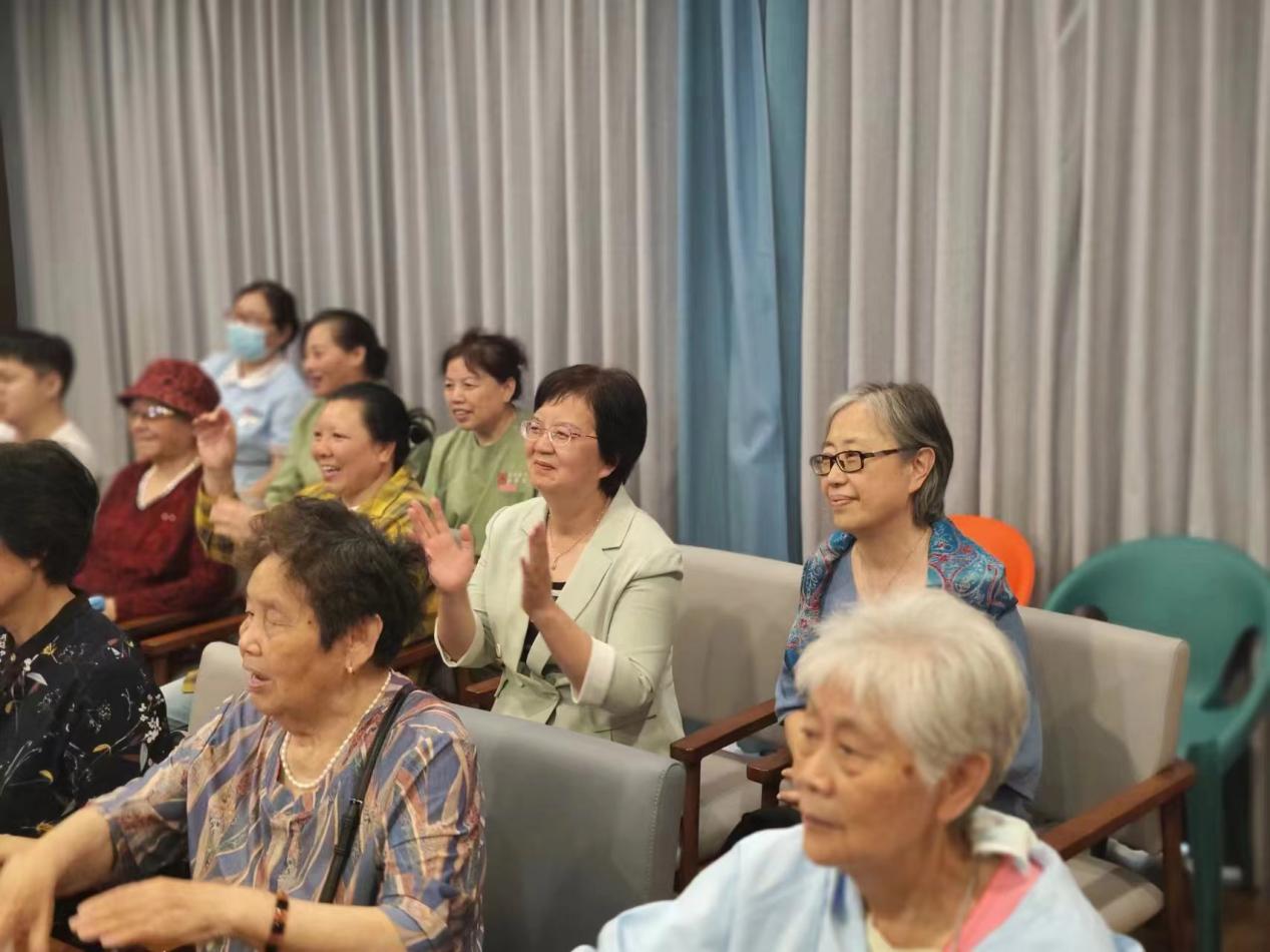 音乐舞蹈学院陈国平博士以一首经典的《红莓花儿开》活跃了全场氛围。随后,音乐舞蹈学院教师董帅带领Healer音乐疗愈服务队成员开启银杏音乐疗愈群体活动。活动中,志愿者们带领老人们进行了拍拍操,让老人们的身体得到了锻炼,在轻松愉快的氛围中增进了彼此的交流。在经典歌曲回忆环节,志愿者们播放了《学习雷锋》《歌唱祖国》等歌曲,老人们在熟悉的旋律中积极跟随示范,主动进行言语、动作的交流,仿佛回到了年轻时的岁月。