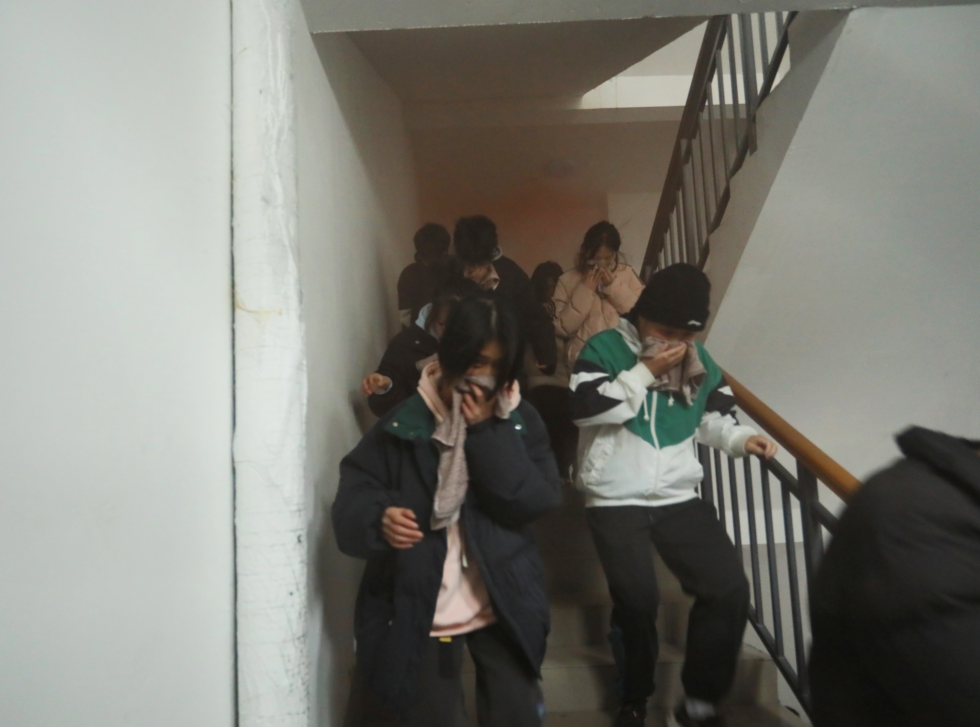 消防演练采取实战模拟演练的模式,模拟设计为学生在图书馆读书、在食堂吃饭、在宿舍休息以及在教学楼上课时出现“突发消防安全事故”情景,学校组织学生进行紧急疏散的过程。