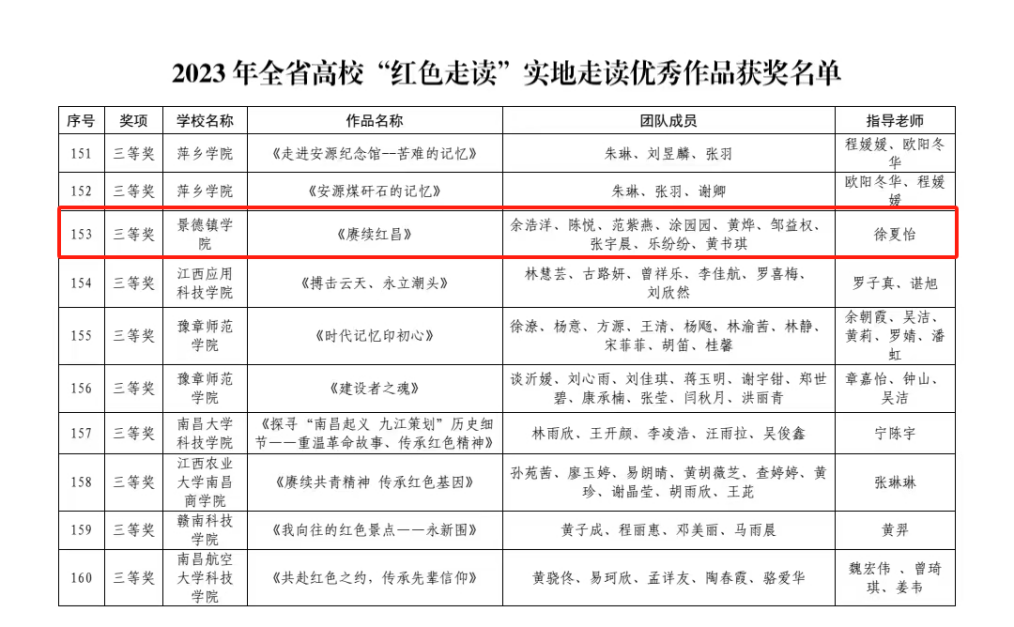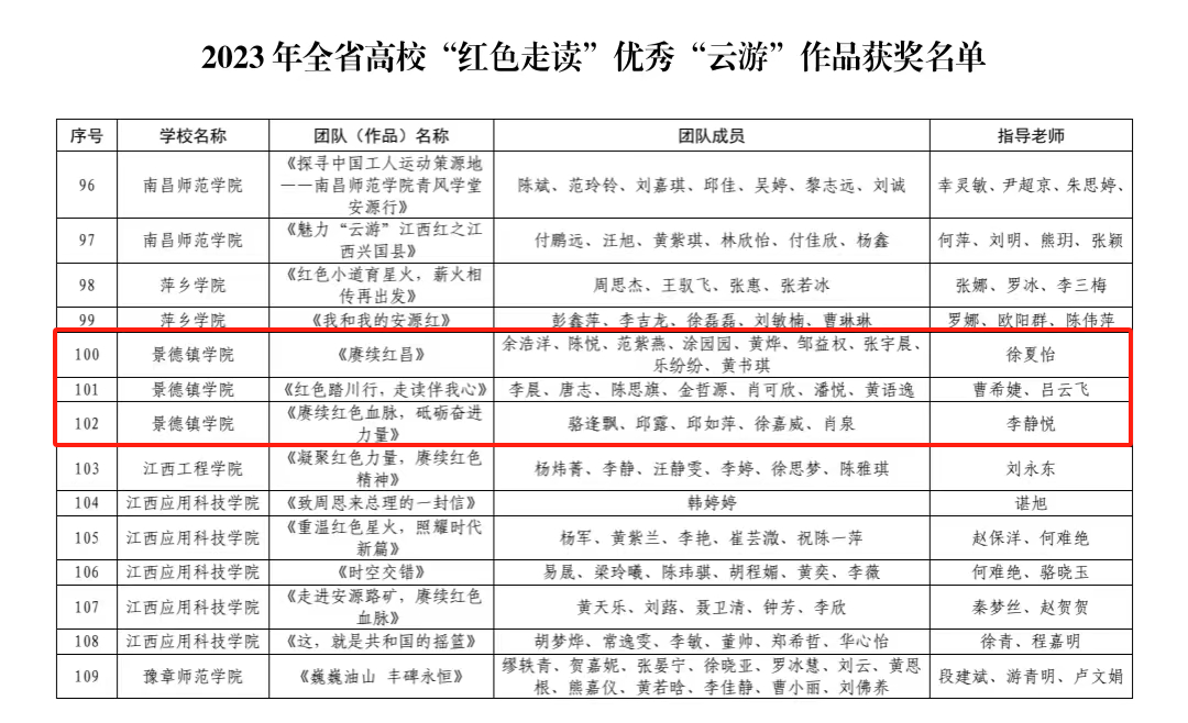 (本网讯:景苑轩)近日,中共江西省委教育工委、江西省教育厅公布了2023年度全省高校“红色班级”创建、“红色走读”、红色动漫创作大赛等活动评选结果名单。其中,beat365官网选送的《赓续红昌》《红色踏川行,走读伴我心》《赓续红色血脉,砥砺奋进力量》三个作品获评全省高校“红色走读”优秀“云游”作品;《重忆井冈》获全省高校“红色走读”实地走读优秀作品二等奖,《赓续红昌》作品获三等奖。