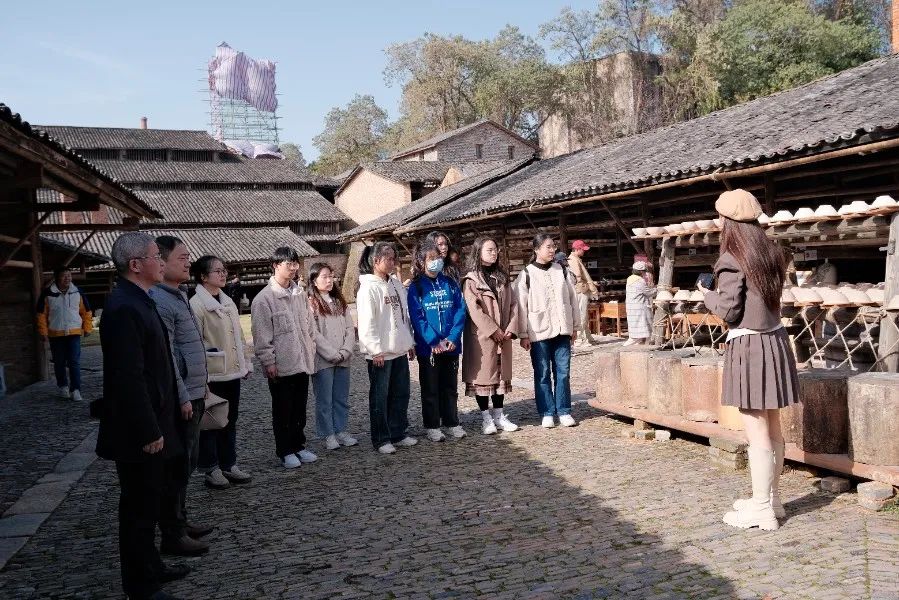 “匠从八方来,器成天下走。一瓷载古今,一景融中外。”习近平总书记指出,陶瓷是中华瑰宝,是中华文明的重要名片。第一站,大家来到明清窑作群。在教师赵娜和学生党支部成员袁甲卓的讲解下,大家沿着习近平总书记的足迹,沉浸式重温习近平总书记考察江西时的重要讲话精神,深切感受习近平总书记对景德镇的殷切期望和对景德镇人民的深情大爱。一排排成型的坯体被整齐摆放在架子上自然晾干,手艺人们正有条不紊地填刻坯体上的图案。大家一边仔细观看木架上米白色的坯体,一边认真聆听明清窑的品种及烧制技术的讲解。