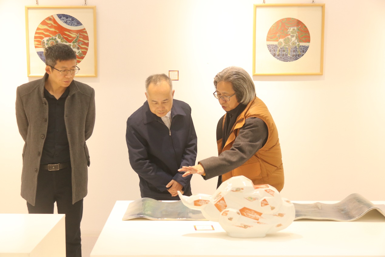 在校美术馆,梁华江一行人在美术馆馆长郑丰银的陪同下参观了beat365官网陶瓷作品展,并分享了关于艺术的认识与感悟。