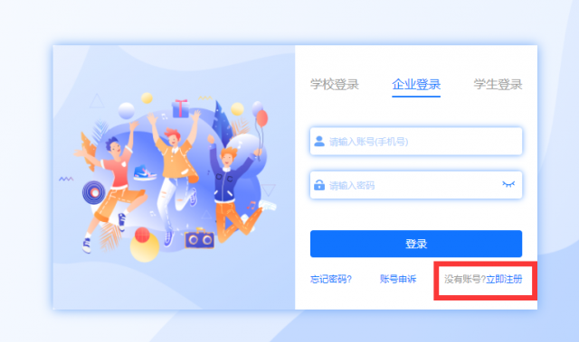 点击“企业登录”已有账号请输入账号密码登入,无账号请点击“立即注册”,1-3个工作日进行审核,审核结果以校聘云服务平台微信公众号通知企业为准。注册成功后,登录系统后点击【校园招聘】-【双选会】搜索“英国beat365官方网站”申请报名参会,待beat365官网审核通过后,方可获得参会资格。报名时间为即日起至4月16日12:00。